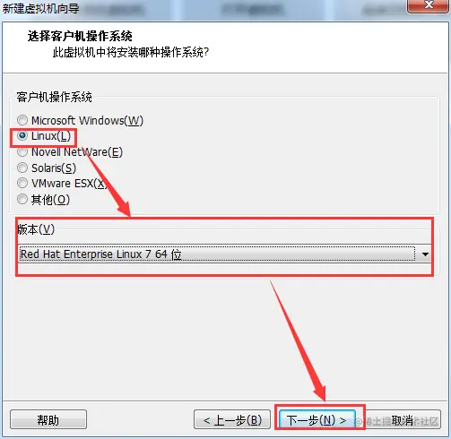 4、客户机操作系统选择"Linux",版本选择“Red Hat Enterprise Linux 7 64 位”,然后“下一步”。