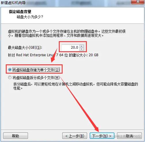 6、最大磁盘大小:最小不能低于20GB,勾选“将虚拟磁盘存储为单个文件”,然后“下一步”。