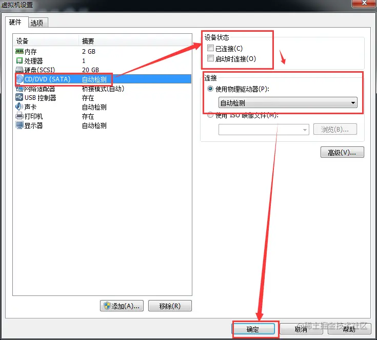 22、(2)设备状态,取消“已连接,”取消“启动时连接”,连接勾选“使用物理驱动器”,然后完成。