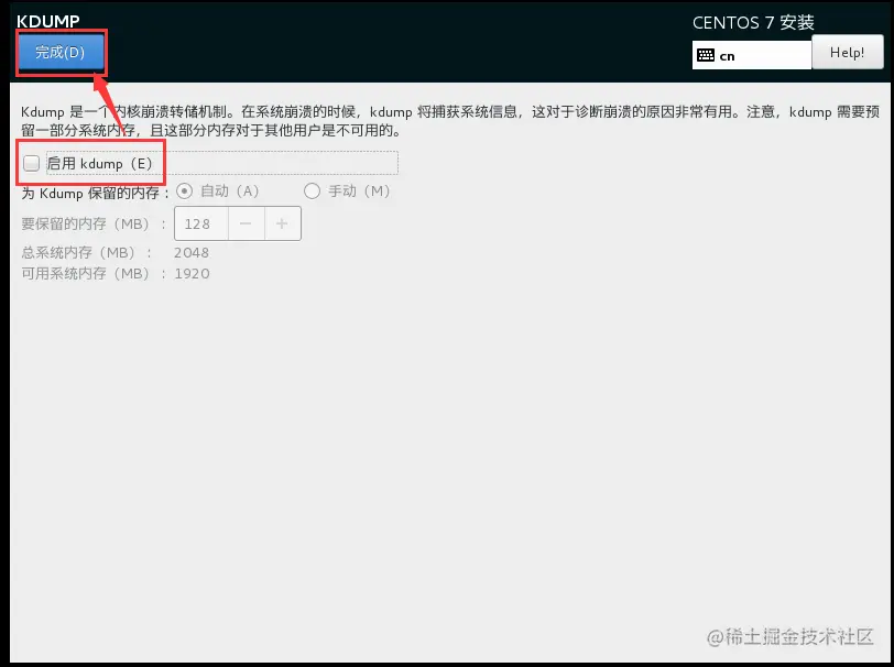 17、(2)不勾选"启用kdump",然后点击“完成”。