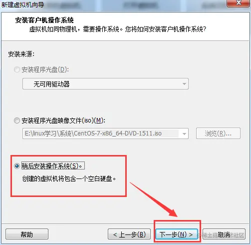 3、选择“稍后安装操作系统”,然后“下一步”。