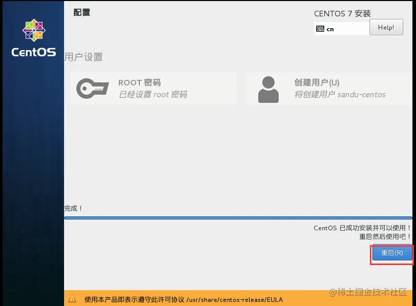 23、最后点击“重启”。若不执行第22步,直接点击“重启”,又会回到一开始的那个安装界面,BIOS中的启动项在起作用,所以需要去掉第一个启动项。