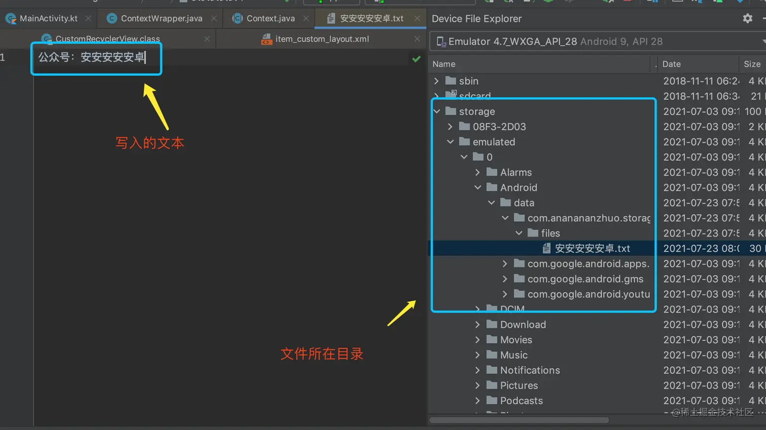 上面的代码中会在外部专属存储目录(/storage/emulated/0/Android/data/com.ananananzhuo.storage10demo/files)下创建一个安安安安安卓.txt的文件,这里我们没有声明和申请任何权限。执行代码后去看文件选择器中的展示如下: