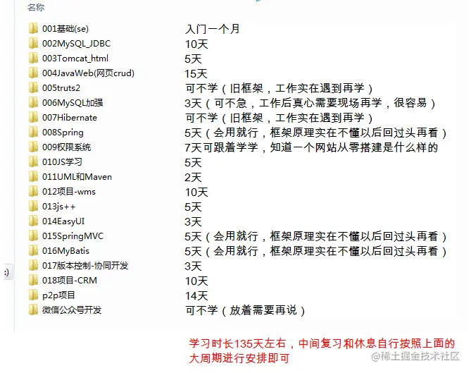 - 大周期:每天学习时间五个小时以上的,建议3+1学习周期。即三天学习,一天复习。复习什么?不是叫你复习代码,背代码,复习的资料其实你都有,就是你的笔记。每天看视频时间3小时或以下的,4+1复习周期。