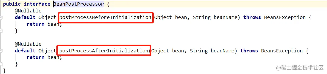 点进去 BeanPostProcessor 会看到有2个方法,这就是后置处理器过程中先后调用到的方法: