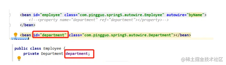 <bean id="employee" class="com.pingguo.spring5.autowire.Employee" autowire="byName">