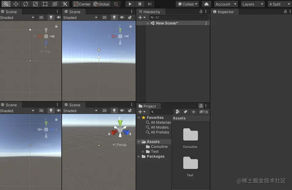 4 Split布局提供了四个Scene窗口,这四个窗口是从不同角度看过去的,所以当你想看场景中某个模型的全面视角时,推荐你切换到这个布局。