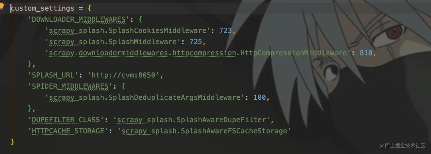 我用的最多的地方,就是使用Scrapy-Splash插件的时候,因为要发起的是SplashRequest,而不是之前的Request,所以要进行单独的配置。为了不改变全局配置、影响其他爬虫,通常在程序内定义这些配置。