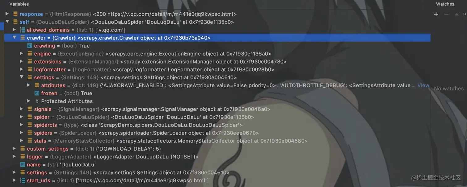 我们通常也将数据库的用户、密码、ip等信息配置在settings中,然后通过crawler对象来获取。该对象提供对所有Scrapy核心组件的访问,可以debug看一下。