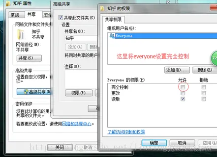 在共享的文件或文件夹上操作:属性->共享(下的网络路径设置共享)->高级共享(下的共享此文件夹打钩)->权限->设置everyone完全控制,全部确认后退出