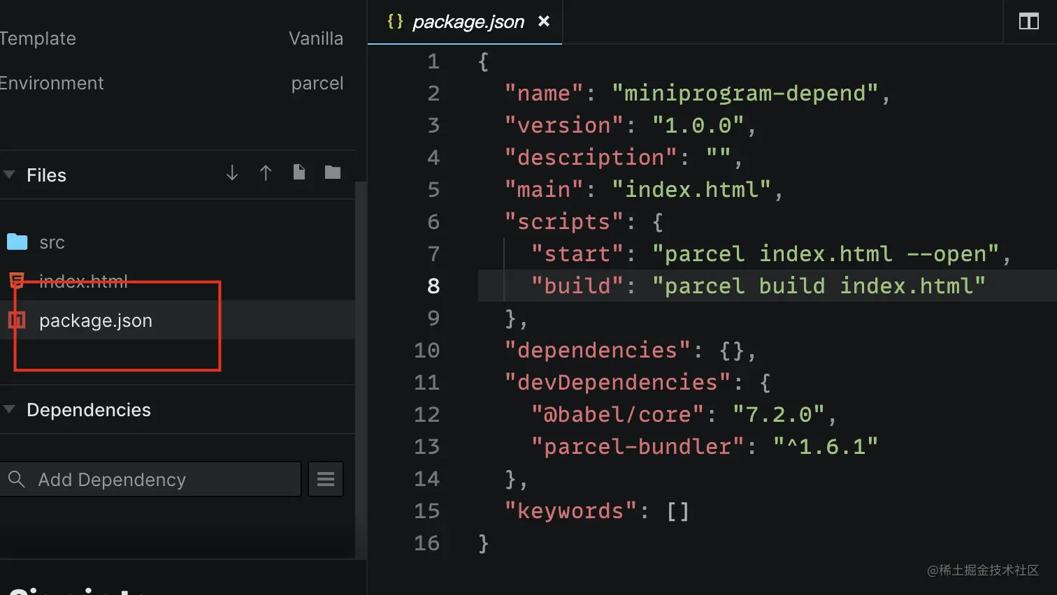 为了方便演示,我们先 fork 一份小程序的官方demo,然后新建一个文件 depend.js,依赖分析相关的工作就在这个文件里面实现。