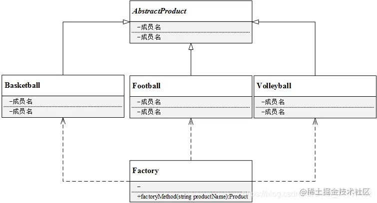 - 从抽象产品类中派生出多个具体产品类,如篮球类、足球类、排球类,具体产品类中实现具体产品生产的相关代码;