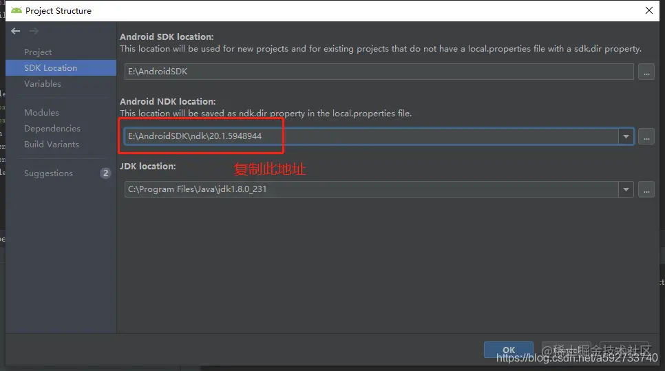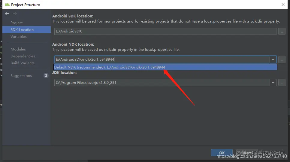 2.第二步,给AS指定NDK位置。下载完成后,打开 File -- Project Structure -- SDK Location,点开下拉箭头后选择默认位置。