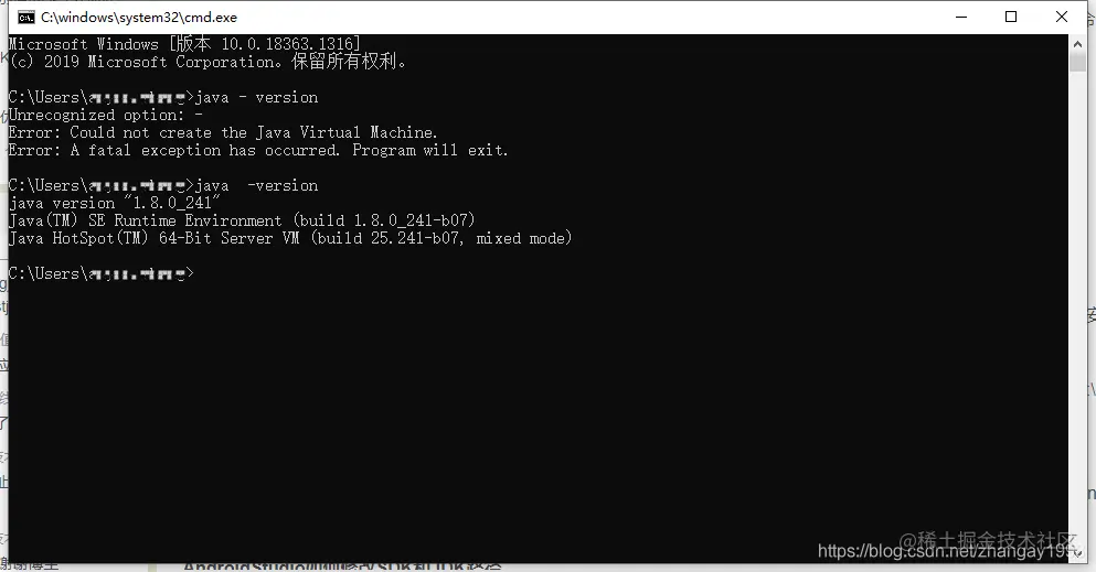 选择“ 开始 ”–>“ 运行 ”,或者直接按下组合键“ Win + R ”,在命令框输入“ cmd ”,回车进入DOS界面(黑框框),在命令行输入“ java -version ”