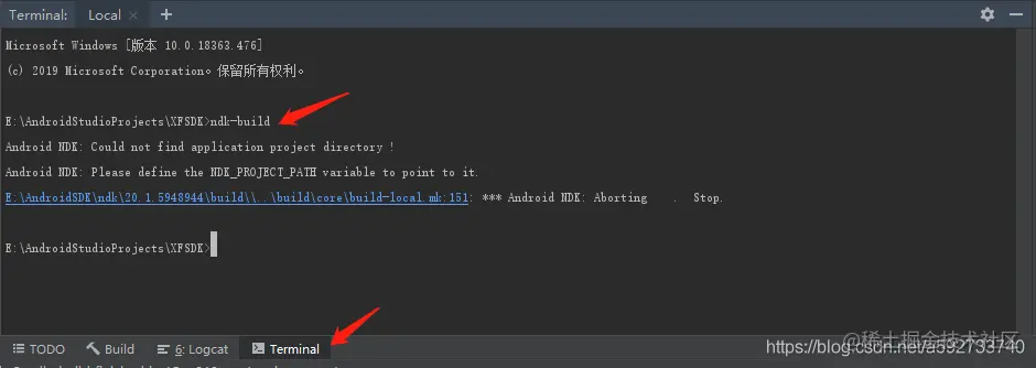 4.第四步,测试。重启AS,在Terminal命令行中,输入ndk-build,如果显示下面的输出,表示NDK已安装配置成功。