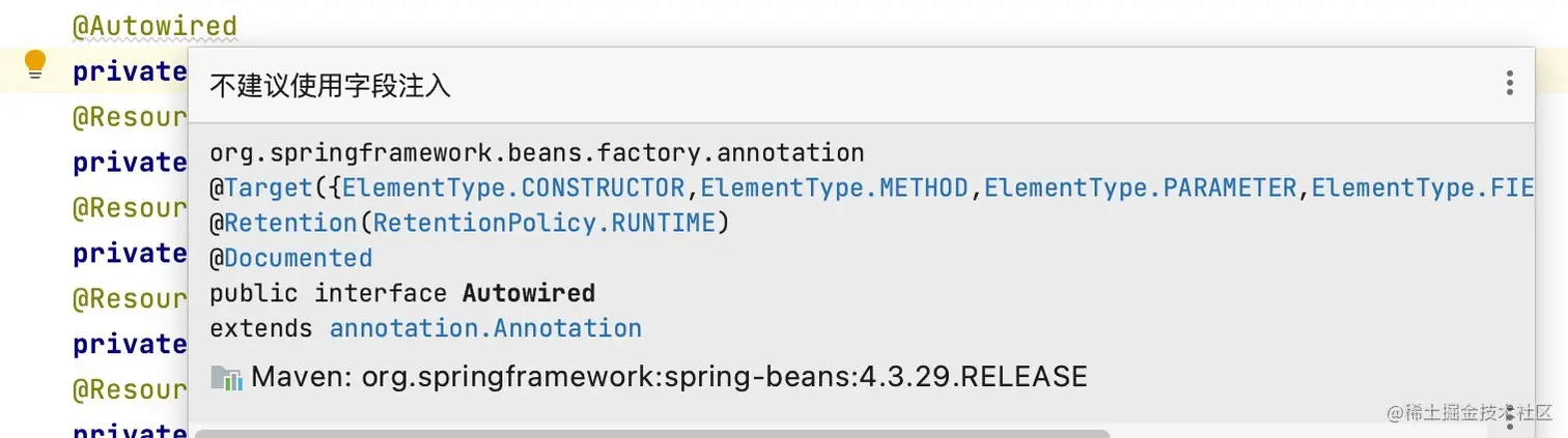 这么说吧,因为 @Resource 是 java 自带的!以及在 idea 中不会有黄色提示线。而如果用 @Autowired 则 idea 会提示 "不建议使用字段注入 "。这可是喜欢干净的人的福利呀,为什么你还不用上呢?