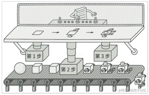 看图我们就能很好地理解,图中就是工厂中的流水线模式,建造者就好比整条流水线,通过流水线上每个装配点的工人将一个个产品零件组装整合成一个完整的产品即可。