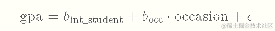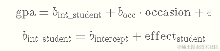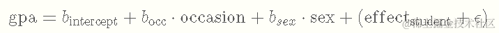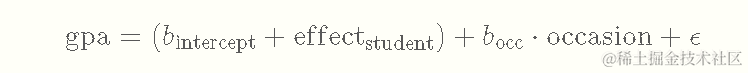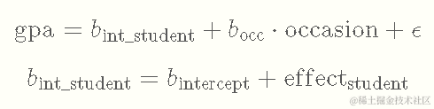 这样一来,我们就会有针对学生的截距,因为每个人都会有自己独特的影响加到总体截距上,导致每个人的截距不同。