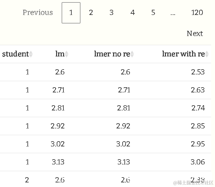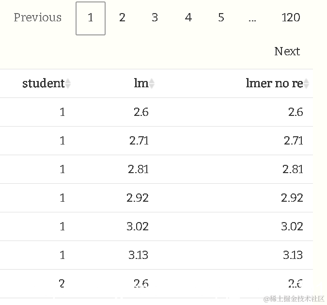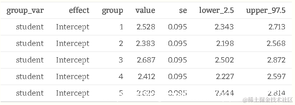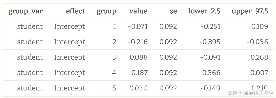 运行模型后,我们实际上可以得到学生效应的估计值。我为前五个学生展示了两种方法,既可以作为随机效应,也可以作为随机截距(即截距+随机效应)。