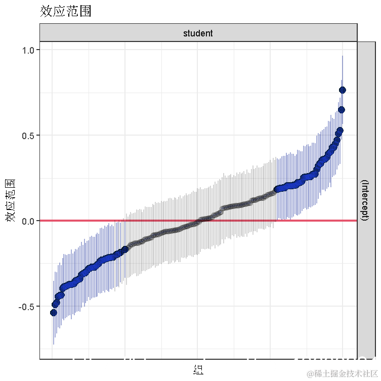 下面的图是每个学生的估计随机效应及其区间估计。随机效应是正态分布,其平均值为零,由水平线表示。不包括零的区间用粗体表示。