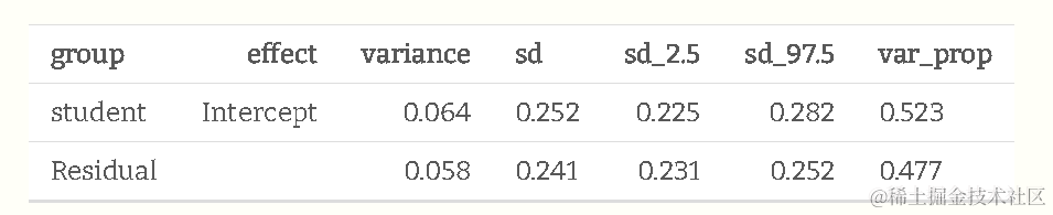 另一种解释方差输出的方法是注意学生方差在总数中的百分比,或0.064 / 0.122 = 52%。这也被称为类内相关,因为它也是对群内相关的估计,我们将在后面看到。