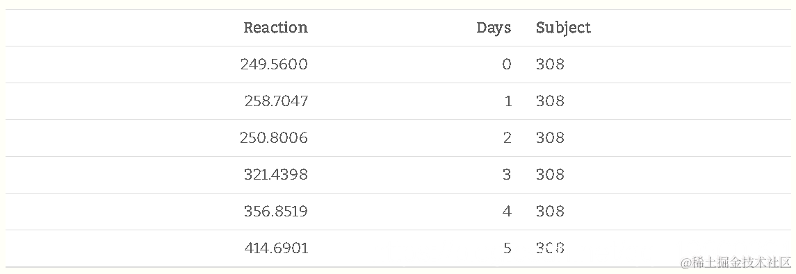 睡眠限制研究中的受试者每天的平均反应时间。在第0天,受试者有正常的睡眠量。从那天晚上开始,他们被限制在每晚3小时的睡眠时间。观察结果代表了每天给每个受试者的一系列测试的平均反应时间(以毫秒计)。