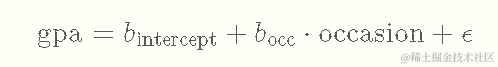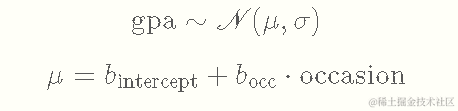 更严格地说,GPA和μ变量有一个隐含的下标来表示每个观察值,但你也可以把它看成是单个个体在单个时间点的模型。