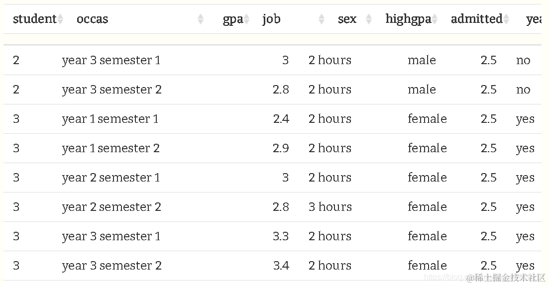 下面我们将评估预测大学平均成绩(GPA)的因素。200名学生中的每个人都被评估了六次(前三年的每个学期),因此我们在学生中进行了观察分组。我们还有其他变量,如状态、性别和高中GPA。有些会以标签和数字的形式出现。