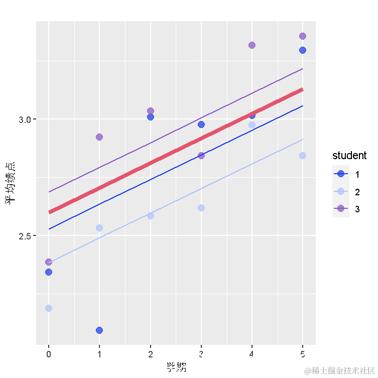 所有学生的路径都以淡色路径显示,10个样本以粗体显示。我们稍后要做的回归所估计的总体趋势显示为红色。有两件事很突出。一是学生在开始时有很大的变数。第二,虽然GPA的总体趋势是随着时间的推移而上升但个别学生在这个轨迹上可能会有所不同。