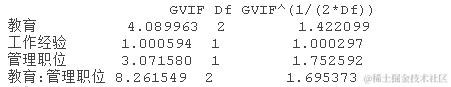 预测变量edu、exp和mngt的VIF值均小于5,因此满足这一假设。