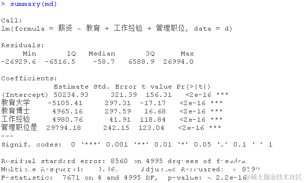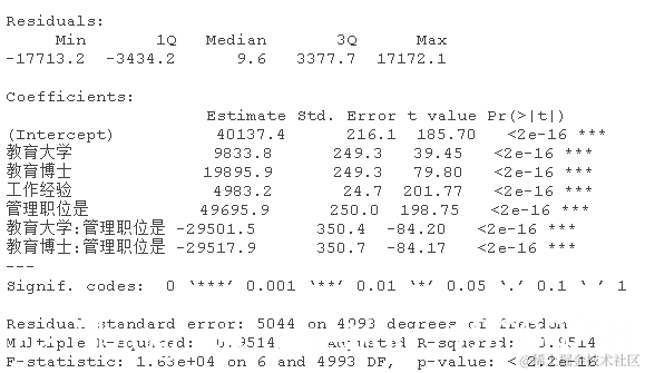 虽然这些参数在统计学上是有意义的,但这并没有任何意义。与高中相比,大学学历怎么可能使你的工资减少5105?