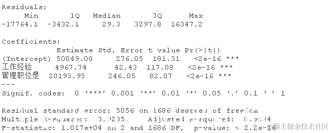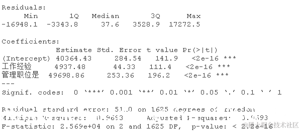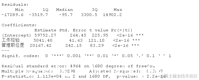 我们只将工资与教育、经验和管理职位进行回归。其结果是