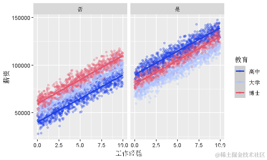 有管理职位和没有管理职位的人的工资和经验之间的关系,以教育为基础。