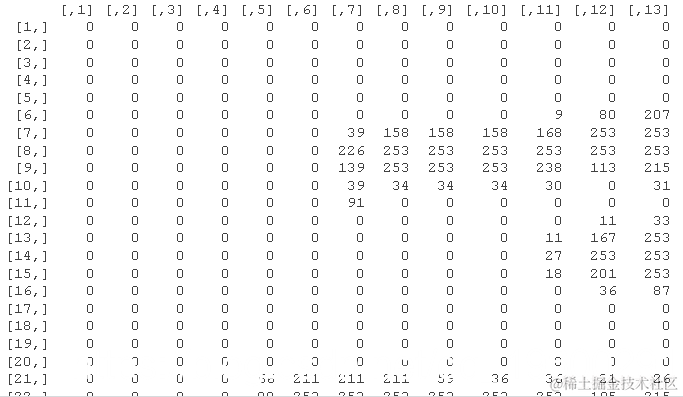 MNIST数据集的数据结构简单明了,有两块。(1) 训练集:x(即特征):60000x28x28张量,对应于60000张28x28像素的图像,采用灰度表示(即每个28x28矩阵中所有的值都是0到255之间的整数),y(即因变量):一个长度为60000的向量,包含相应的数字,整数值在0到9之间。(2) 测试集:与训练集相同,但只有10000个图像和因变量。数据集的详细结构可以通过下面的str(mnist)看到。