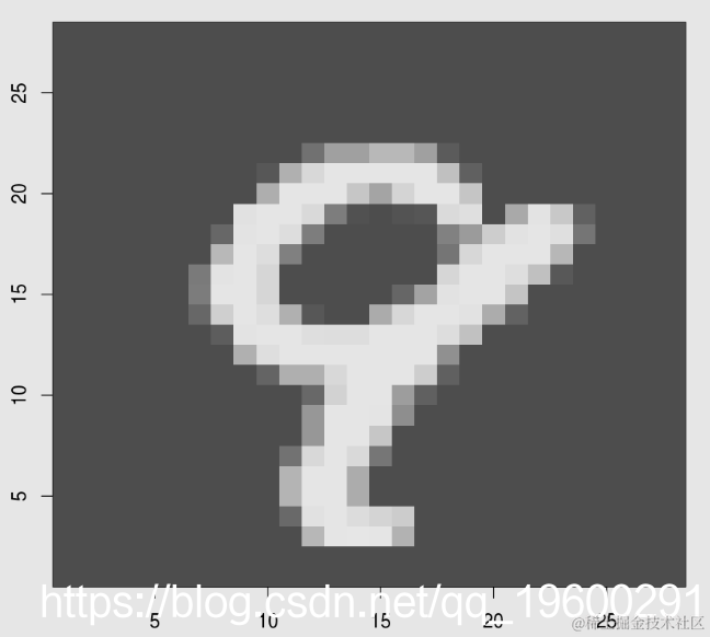 现在让我们使用R将一个选定的28x28矩阵绘制成图像。显示图像的方式是从矩阵表示法中旋转了90度。因此,还需要额外的步骤来重新排列矩阵,以便能够使用image()函数来显示它的实际方向。