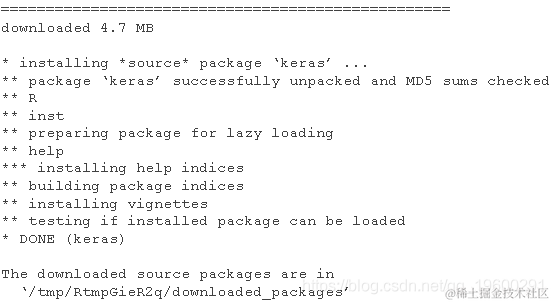 由于keras只是流行的深度学习框架的一个接口,我们必须安装一个特殊的深度学习后端。默认和推荐的后端是TensorFlow。通过调用install_keras(),它将为TensorFlow安装所有需要的依赖项。下面的单元格需要一分钟左右的时间来运行。