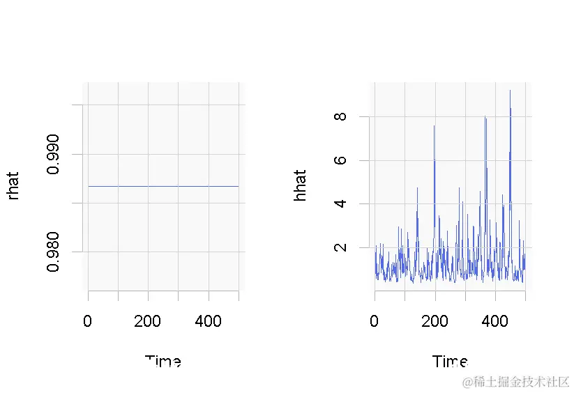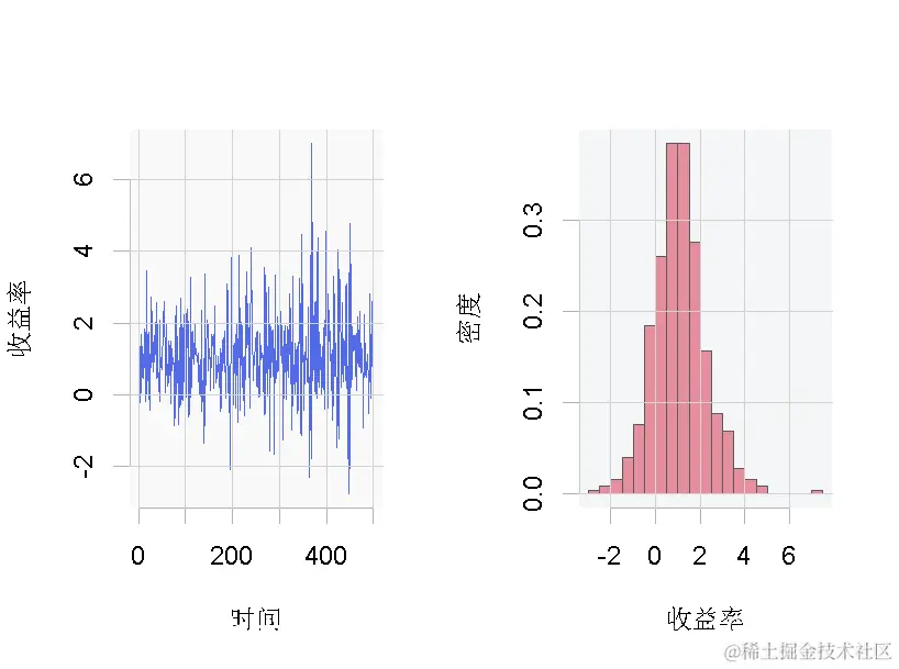 下面的例子使用了数据集,它包含了500个股票收益率的生成观测值。图显示了数据的时间序列图和柱状图。