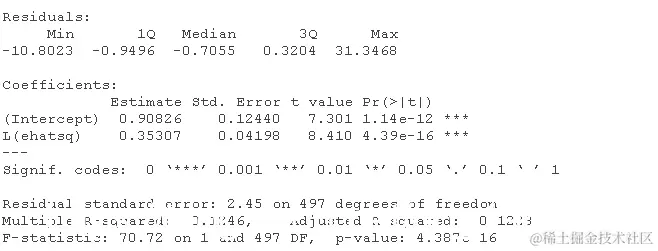 如果我们不使用一步步的程序,而是使用R的ARCH检验功能之一,也可以得出同样的结论。