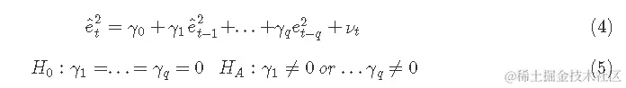 方程4和5给出了测试模型和假设,以测试时间序列中的ARCH效应,其中残差e^t来自于将变量yt回归一个常数,如1,或回归一个常数加上其他回归因子;方程4中的测试可能包括几个滞后项,在这种情况下,无效假设(方程5)是所有这些项都不显著。