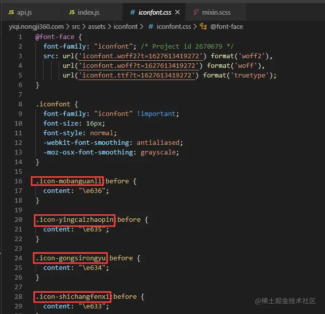 4. 在iconfont.css文件记录了我们所有的字体,直接使用class就可以了,即红框所框选的部分。