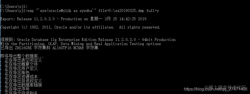 exp "'sys/oracle@testxxxx as sysdba'" file=G:\sx20190325.dmp full=y