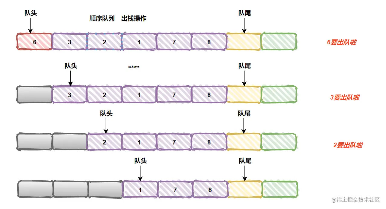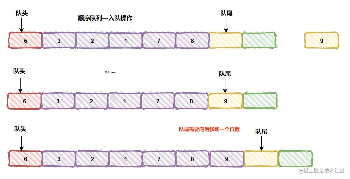 如上图中,当6、3、2、1、7、8依次入队之后,此时队头第一个红色块6,队尾是图中黄色块。当有新的数据9入队的时候是直接放到黄色块中的,当数据入队的后,队尾需要向后移动一个位置。