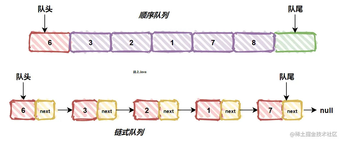 队列是一种操作受限的数据结构,只能先进先出,队列支持两种基本操作:入队和出队。基于数组实现的队列被称为顺序队列,基于链表实现的队列被称为链式队列。