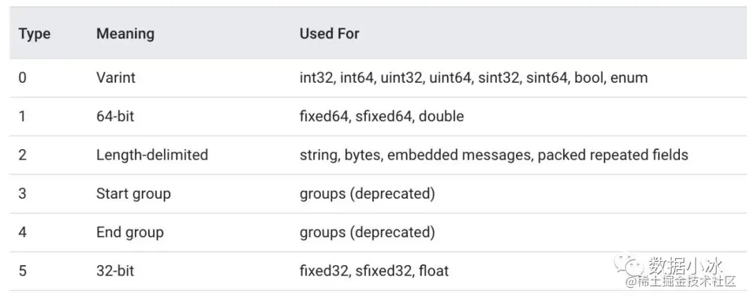 wire_type 值如下表, 其中3和4已经废弃,我们只需要关心剩下的4种。对于 Varint 编码数据,不需要存储字节长度 length。这种情况下,TLV 编码格式退化成 TV 编码。对于64-bit和32-bit也不需要 length,因为type值已经表明了长度是8字节还是4字节。