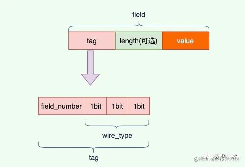 对于 tag 值,它有 field_number 和 wire_type 两部分组成。field_number 就是在前面的 message 中我们给每个字段的编号,wire_type 表示类型,是固定长度还是变长的。 wire_type 当前有0到5一共6个值,所以用3个 bit 就可以表示这6个值。tag 结构如下图。