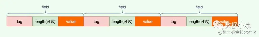 protobuf高效的秘密在于它的编码格式,它采用了 TLV(tag-length-value) 编码格式。每个字段都有唯一的 tag 值,它是字段的唯一标识。length 表示 value 数据的长度,length 不是必须的,对于固定长度的 value,是没有 length 的。value 是数据本身的内容。