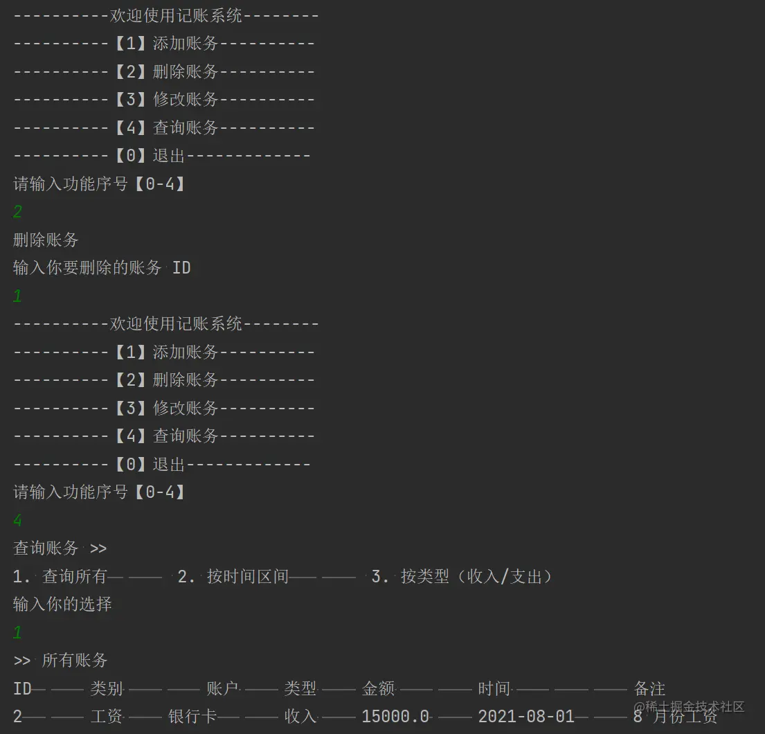 假如我们的账目要公开给别人看,而自己有的账目又不想让别人看到,咋办呢?很简单!我们只需要将这笔账目干掉即可!这里我们只要输入我们所要删除的账单 ID,然后将其从总账目列表中删除即可。