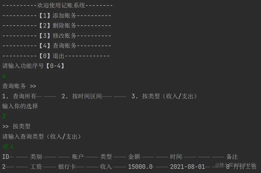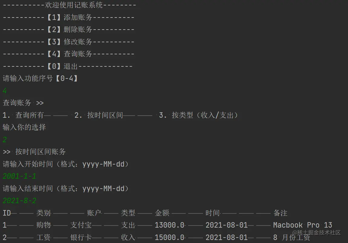 这里按类型查询其实就是在查询所有账单的基础上加上一个限制条件,只要其类型等于我们的输入即可,这里我写了两种筛选的方法。一种是直接使用 if 语句进行过滤,而另一种则是同按时间跨度一样使用集合的 Stream 流来进行过滤。