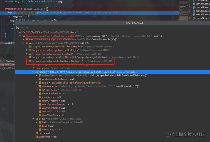 加载的类会放到对应的缓存对象中,缓存对象中的信息和classloader有关系,因此后面加载的时候去获取的时候会获取失败;详细信息点进去可以看到里面的引用的对象的加载器是有BundleClassLodaerJava5加载的。