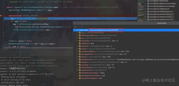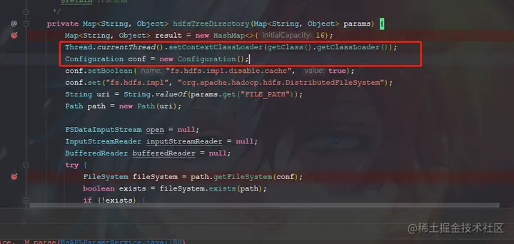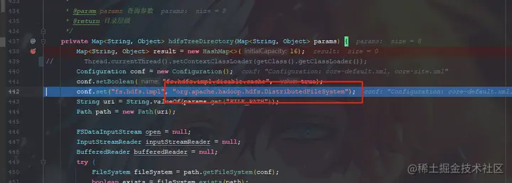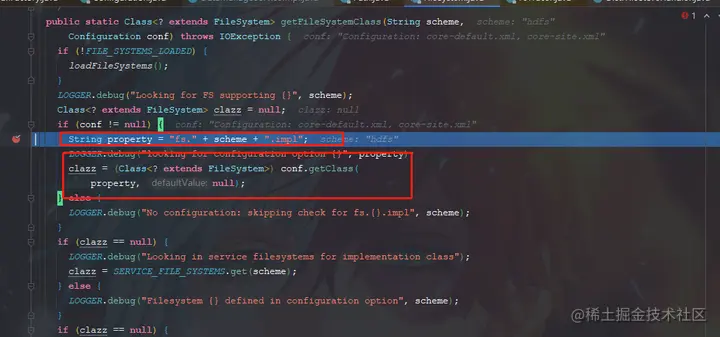 因此这里在创建hadoop的配置类的时候手动修改为当前类的类加载器,然后我们debugger